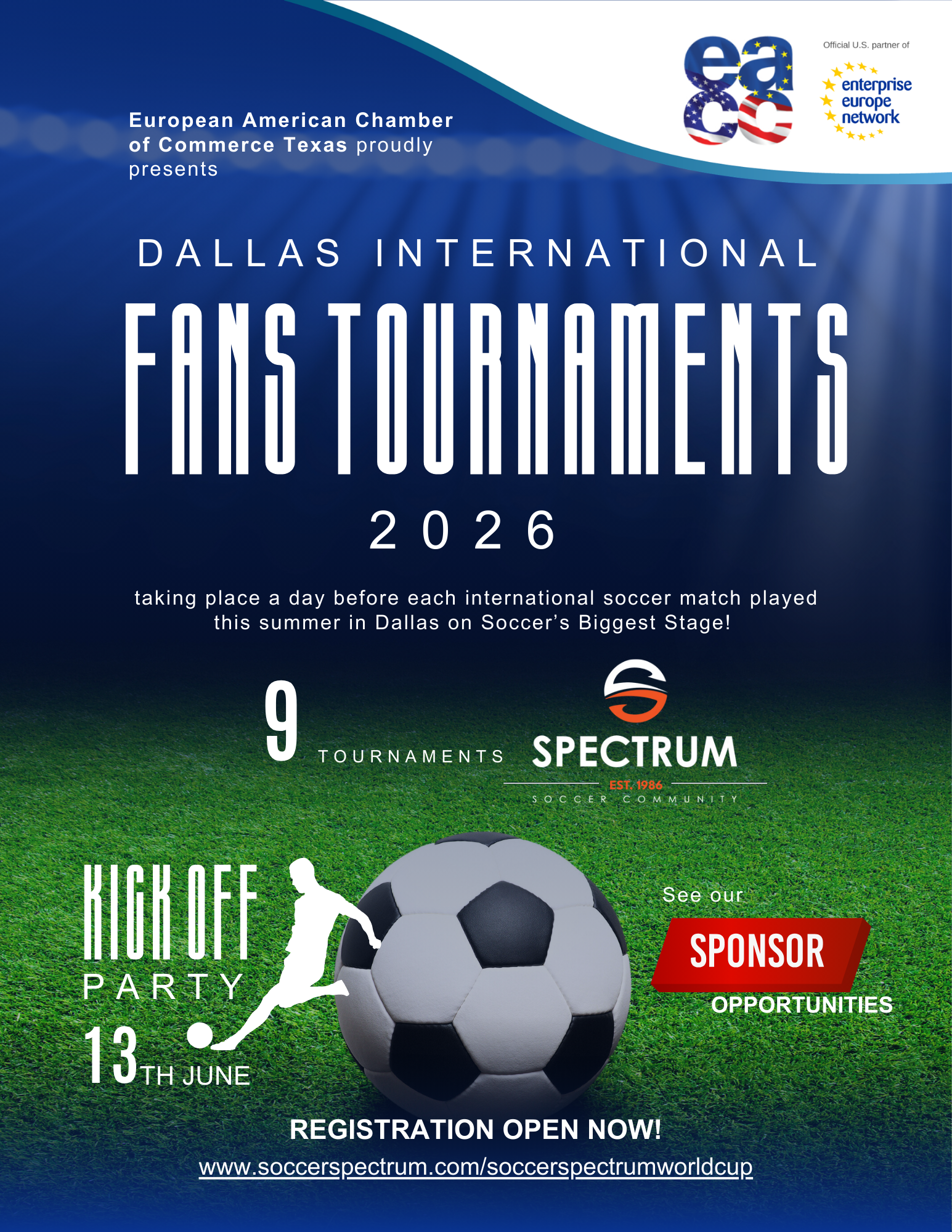 The EACC Texas is partnering with Personal Analytics and Sports Statistics, LLC (PA$$) and Soccer Spectrum to host a series of exciting International Fans Tournaments in Dallas during the summer of 2026! As part of the World Cup excitement, the EACC Texas is inviting fans from every nation competing in Dallas and around the world to participate in our series of one-day Soccer Spectrum World Cup tournaments.